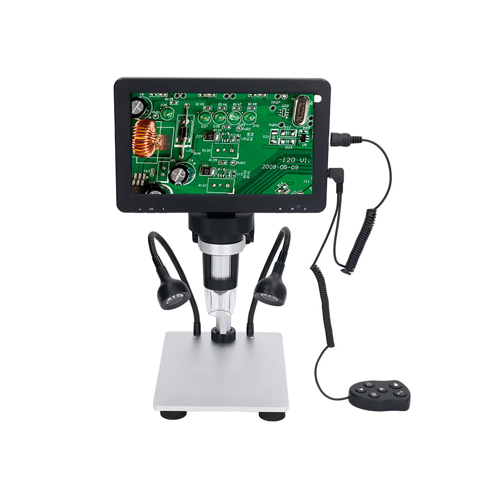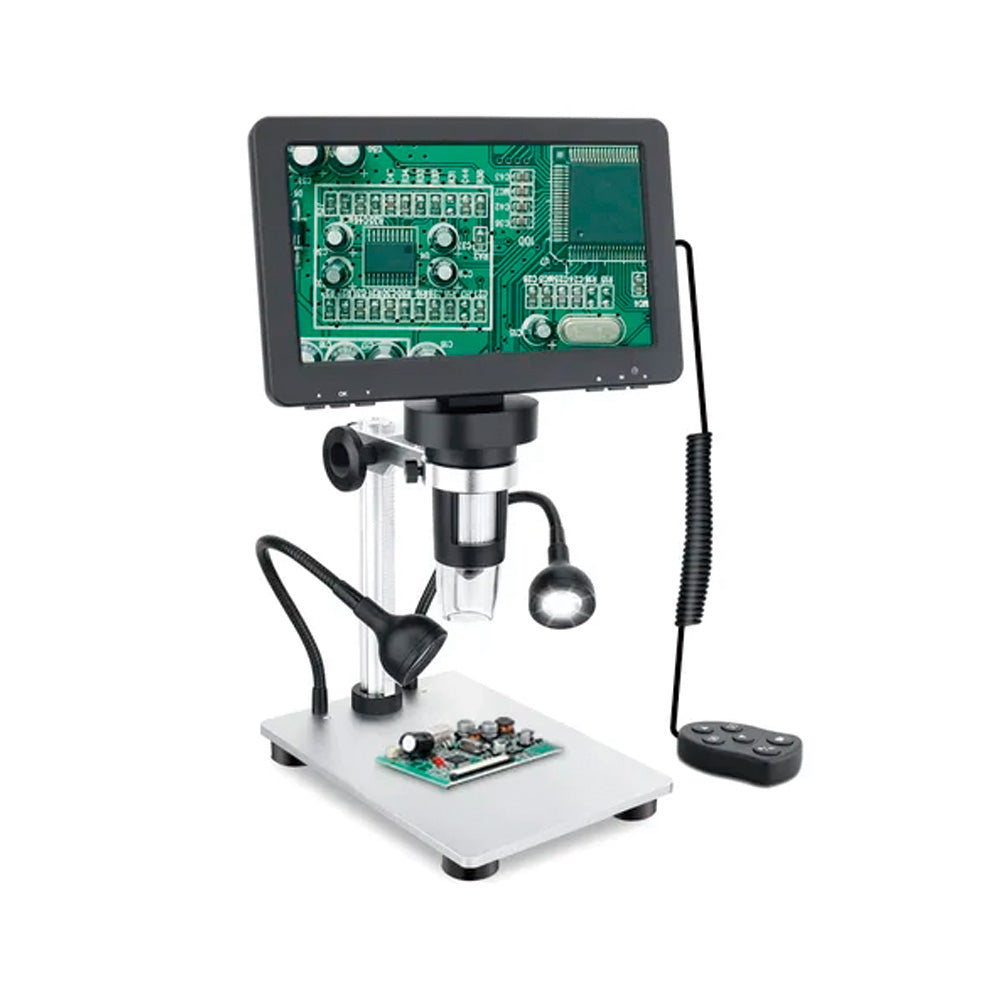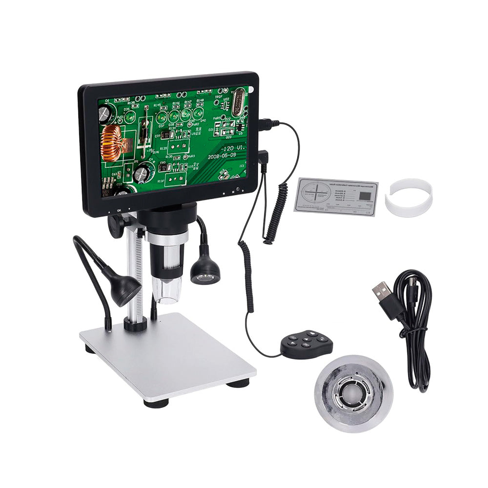 Microscopio digital de alta definición con pantalla de 7 pulgadas y resolución de hasta 12MP. Ideal para inspección de placas de circuito, reparación de teléfonos móviles, relojería, joyería, textiles, pruebas de calidad de la piel y aplicaciones educativas o de investigación.